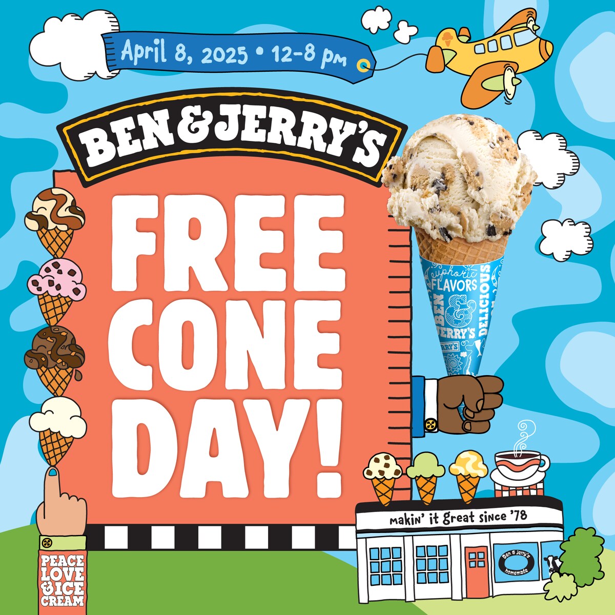 On April 8th Ben & Jerry’s is throwing its annual Free Cone Day celebration, serving up free scoops of ice cream to our biggest fans. Come visit us between 12-8pm!