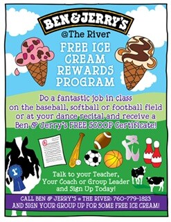 Attention teachers, clubs and organizations! Join Ben & Jerry's Reward Program today. Earn FREE ICE CREAM certificates. Ben & Jerry's celebrates knowing it's helping individuals strive to reach their highest potential and accomplish their goals one scoop at a time! For more information on how to enroll in this program please call 760-779-1823. Ask for Manager, Kyle Von Haden, for more details.