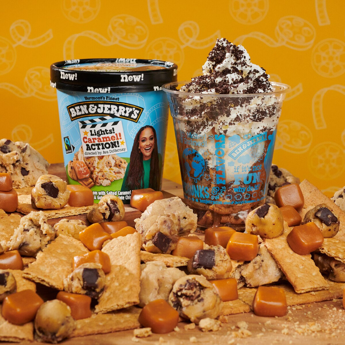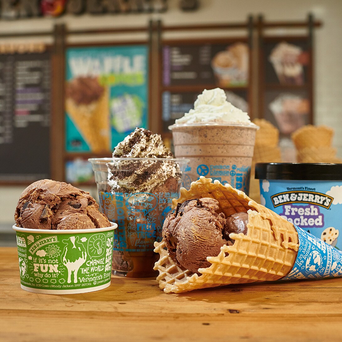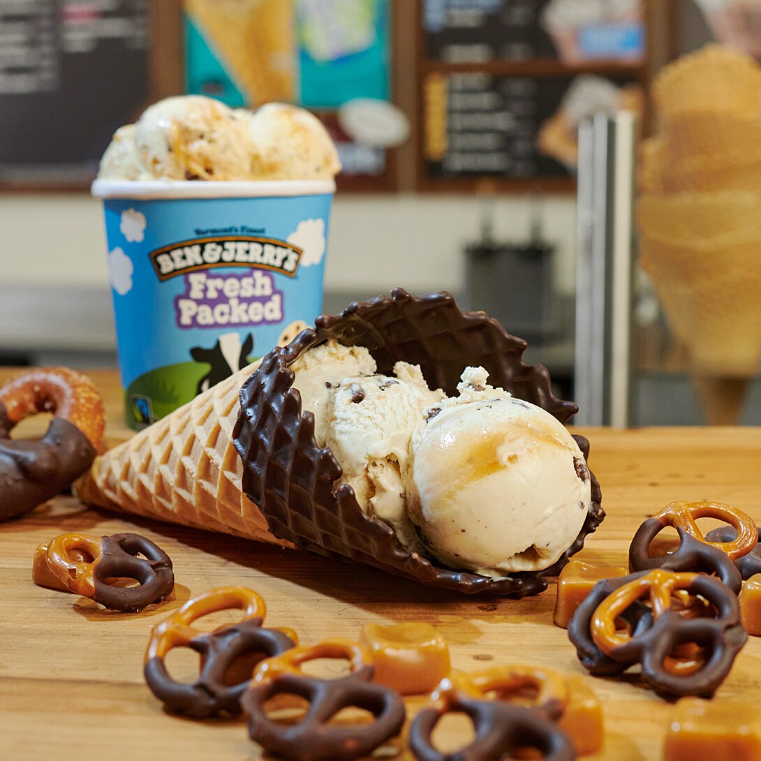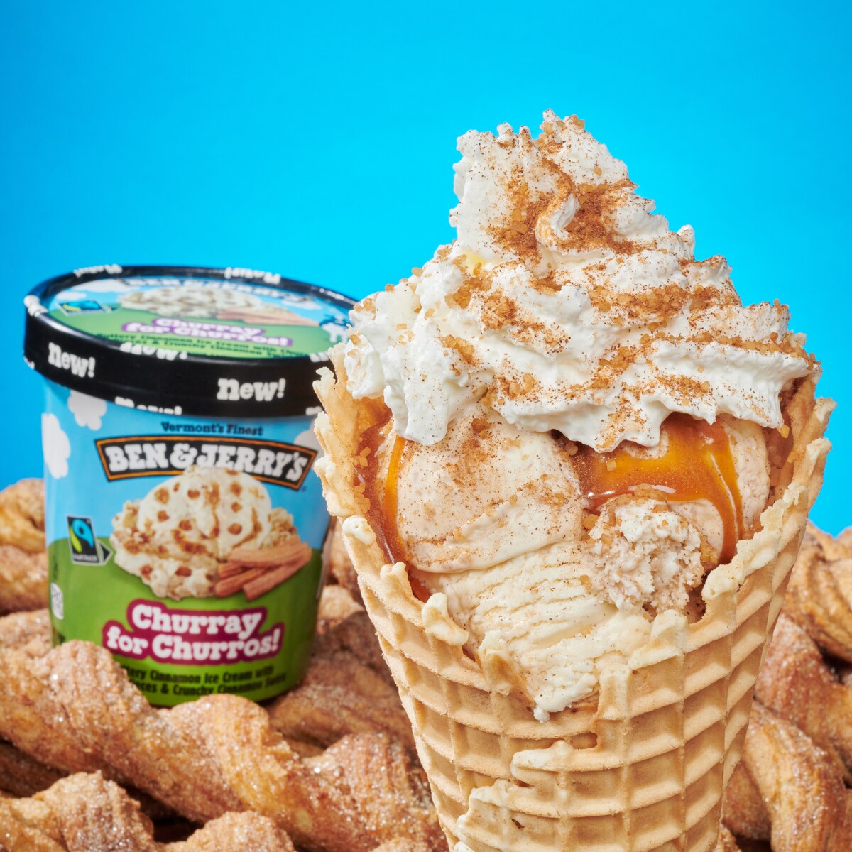 Chip, chip, churray! Churray for Churros! has buttery cinnamon ice cream, churro pieces, and crunchy cinnamon swirls — everything you expect from your favorite churro spot, all churned up in delicious Ben & Jerry’s style. Try it in the Churray for Churros! Waffle Cone Sundae with caramel sauce, fresh whipped cream, and a cinnamon sugar topping for a real churr-whoa experience.